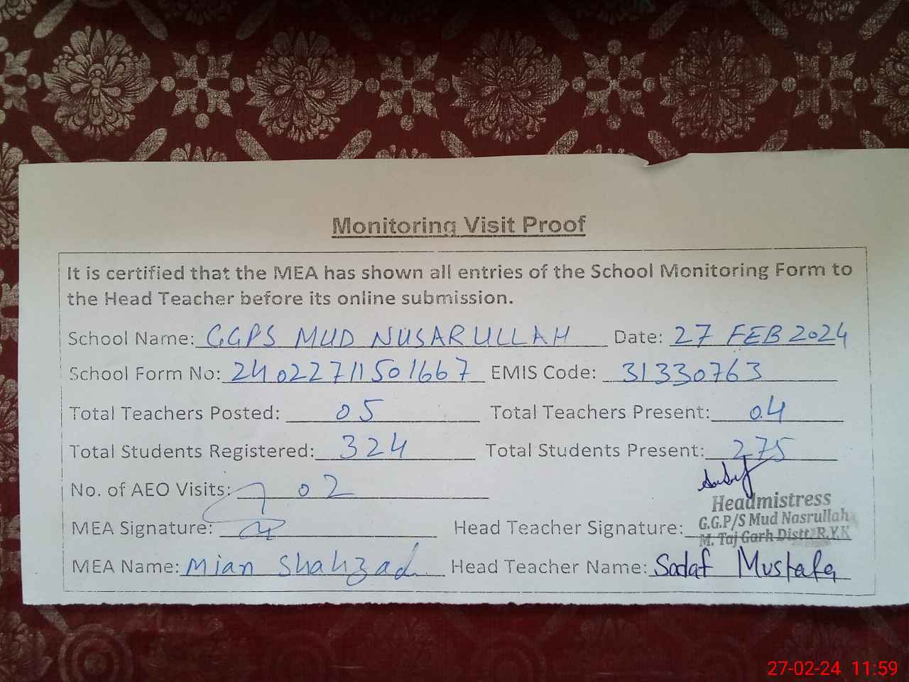 | EMIS Code: 31330763 | Name of School: GGPS MUD NUSARULLAH | |||