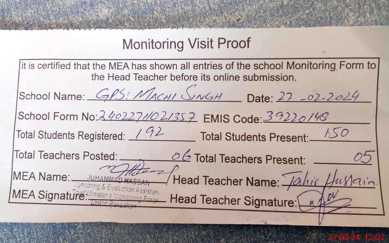 | EMIS Code: 39220148 | Name of School: GPS MACHHI SINGH | |||