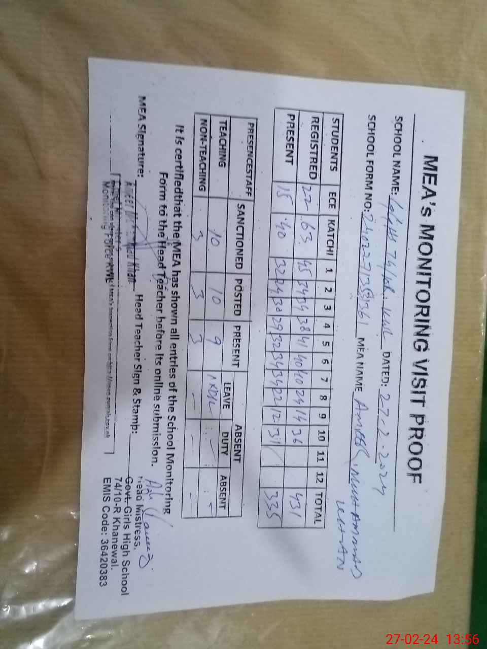 | EMIS Code: 36420383 | Name of School: GGHS 74/10-R, KHANEWAL | |||