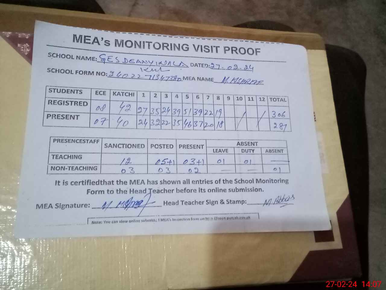 | EMIS Code: 36420072 | Name of School: GES DENAY WALA, KHANEWAL | |||