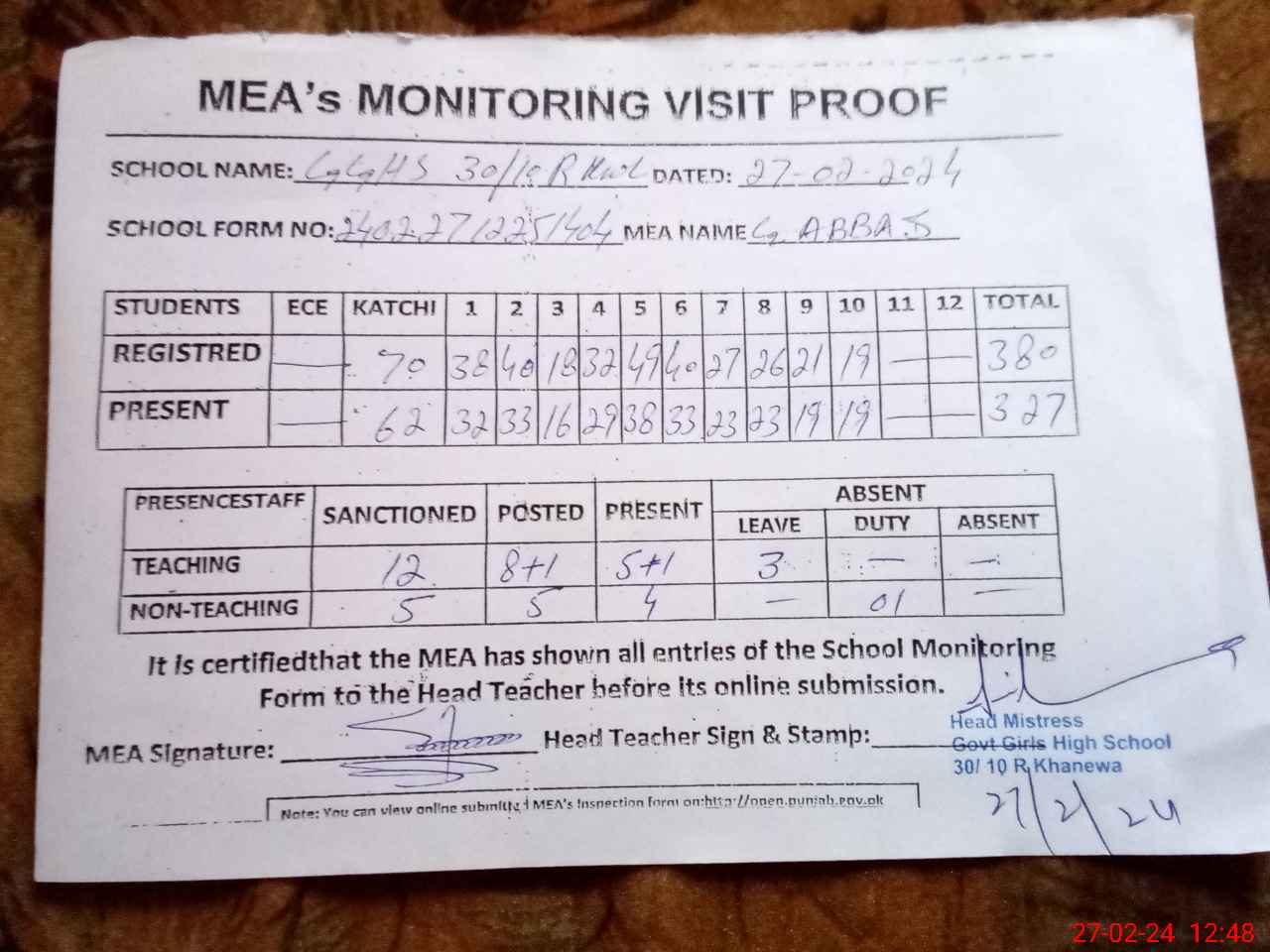 | Attendance Register | Head Teacher | MEA with School | Visit Proof |