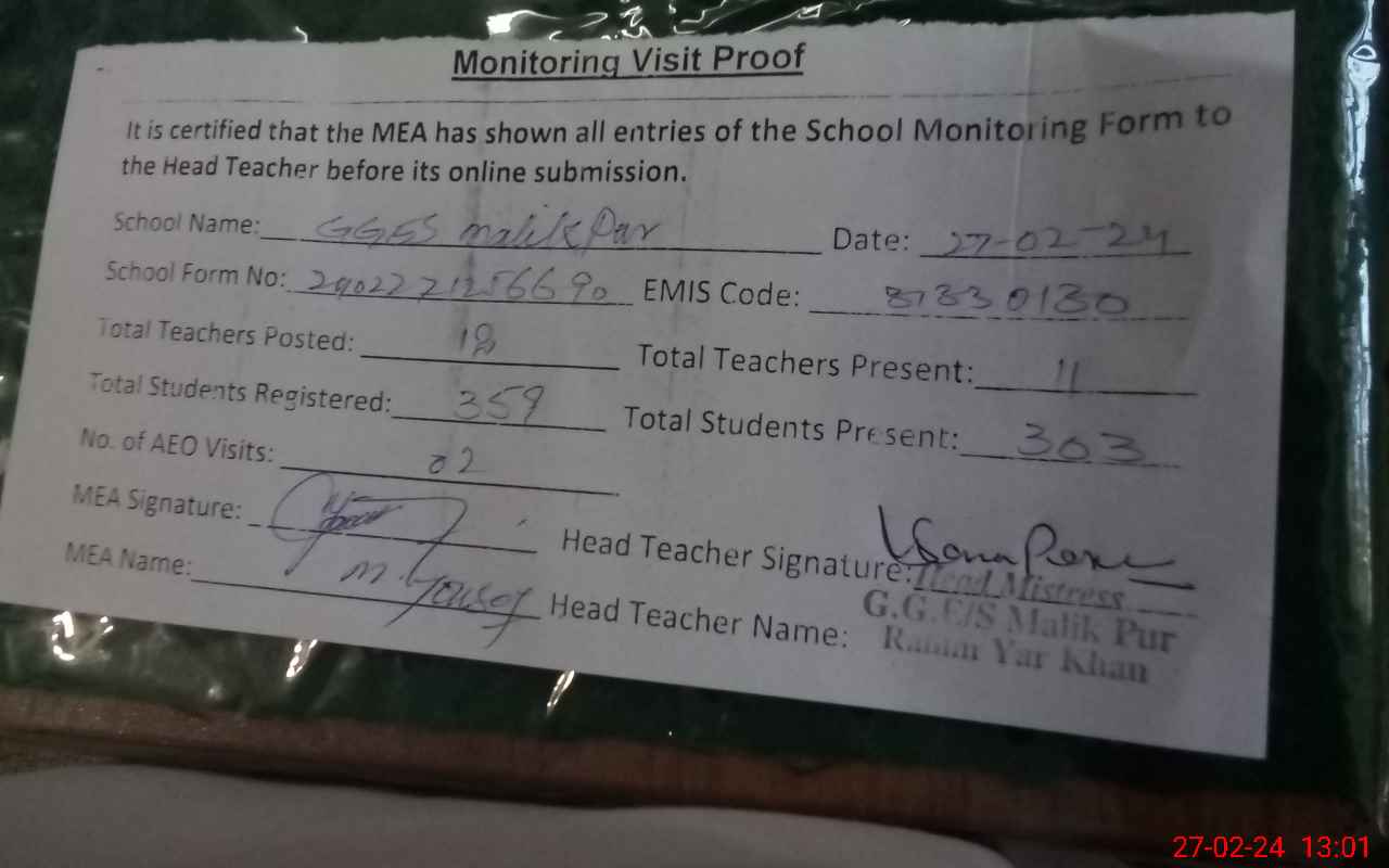 | EMIS Code: 31330130 | Name of School: GGES MALIK PUR | |||