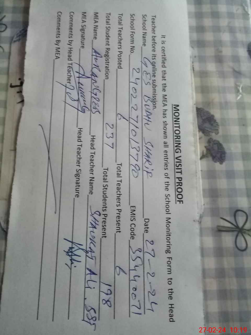 | Attendance Register | Head Teacher | MEA with School | Visit Proof |