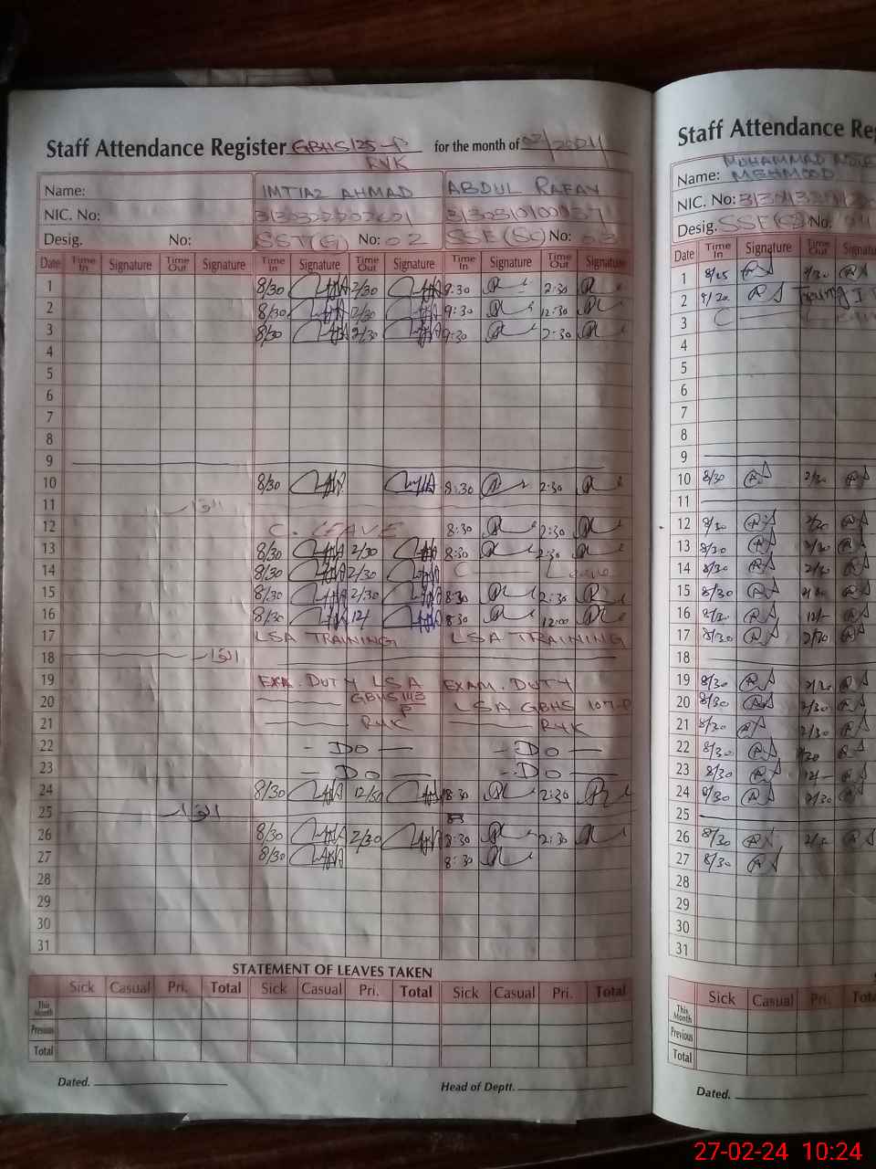 | CNIC | Full Name | Designation | R/C | Absence During Last Calender Month |