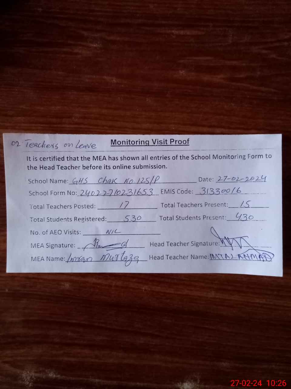 | Attendance Register | Head Teacher | MEA with School | Visit Proof |