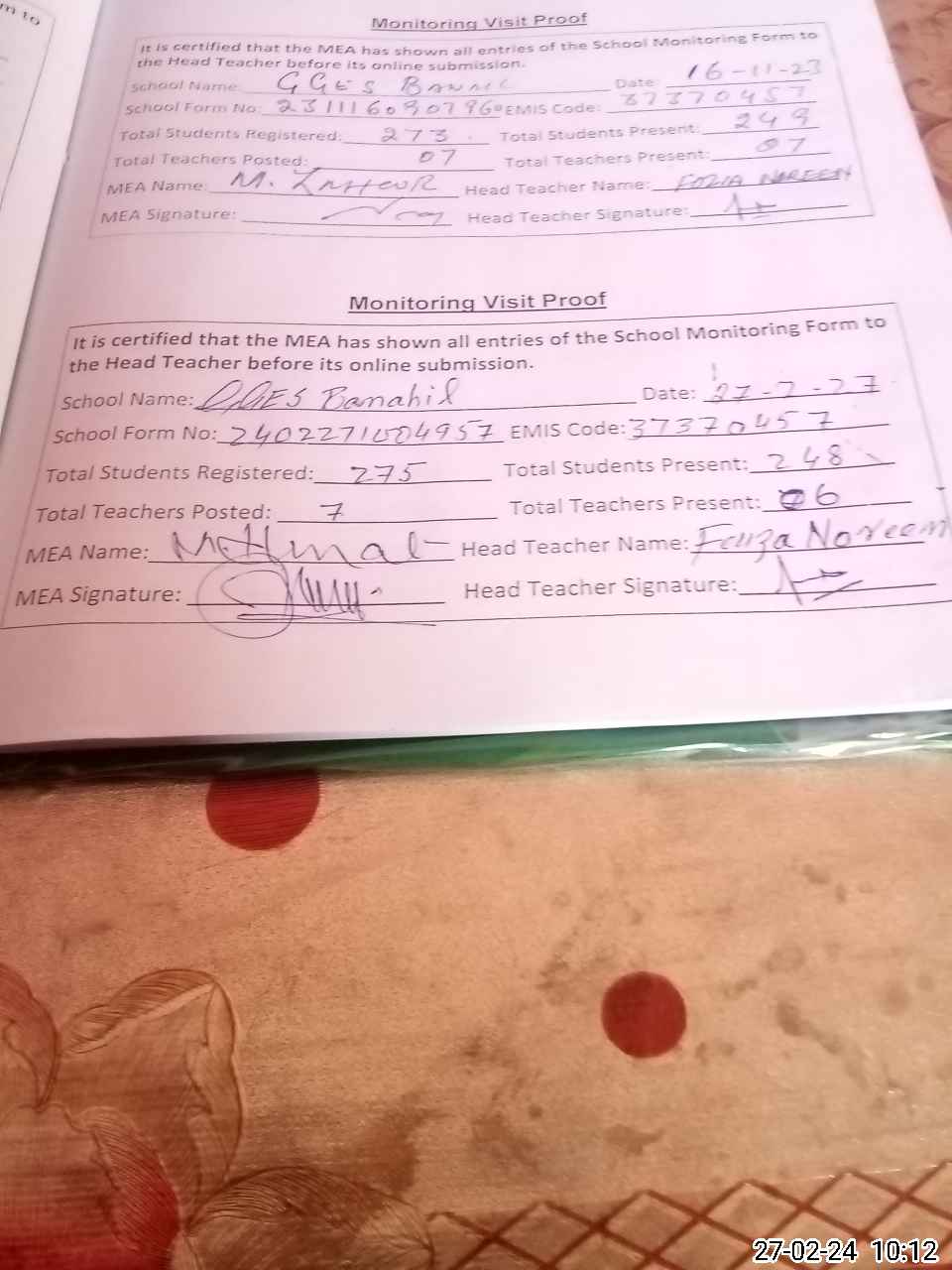 | Attendance Register | Head Teacher | MEA with School | Visit Proof |
