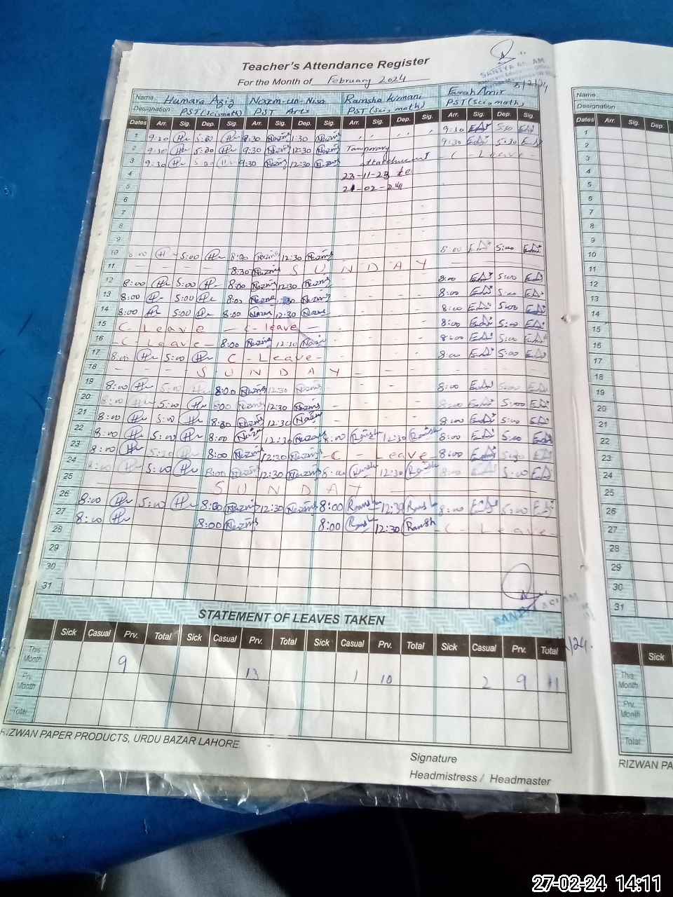 | Leave | Duty | Absent | Maternity | Medical | Ex- Pak |