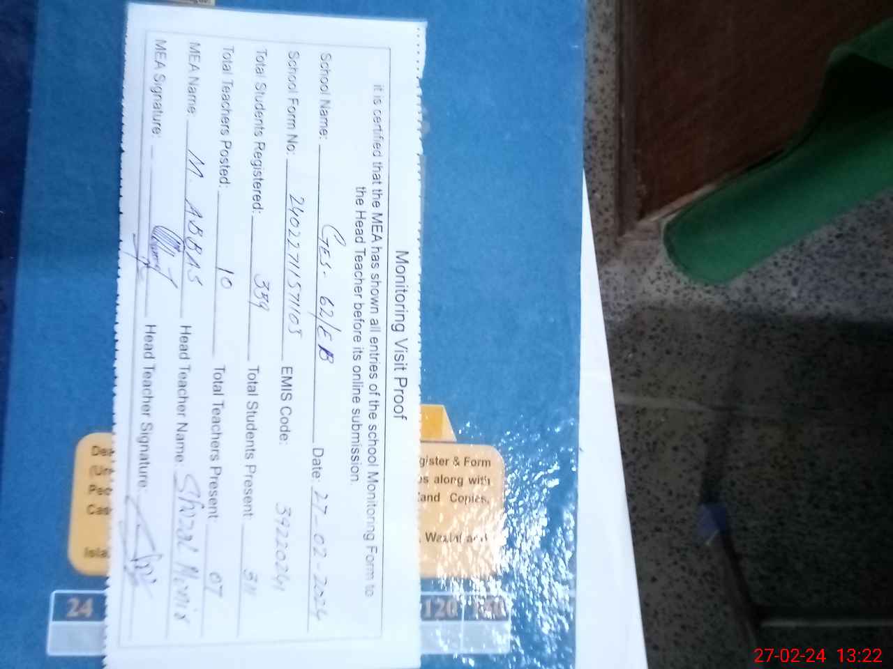 | Attendance Register | Head Teacher | MEA with School | Visit Proof |