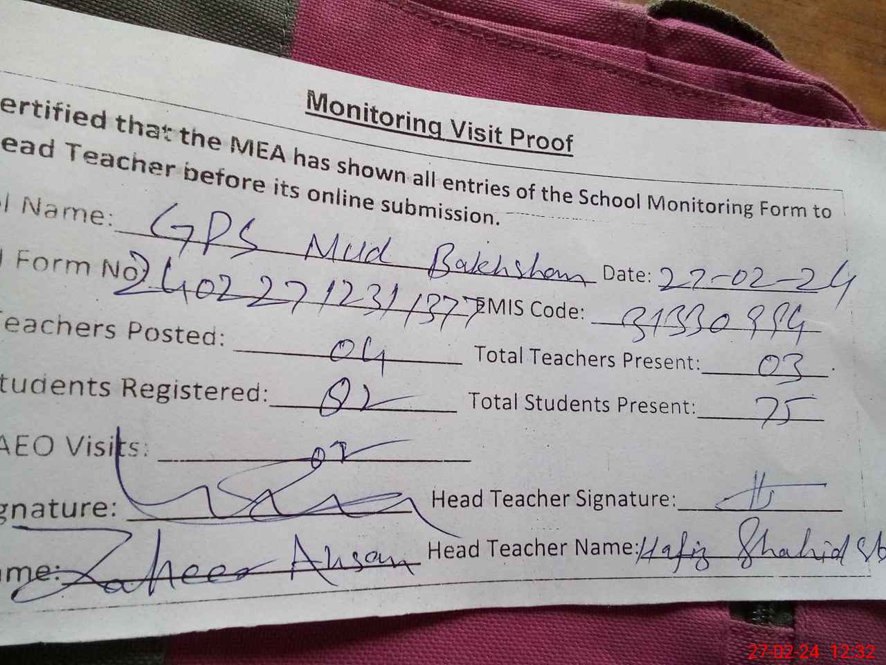 | Attendance Register | Head Teacher | MEA with School | Visit Proof |