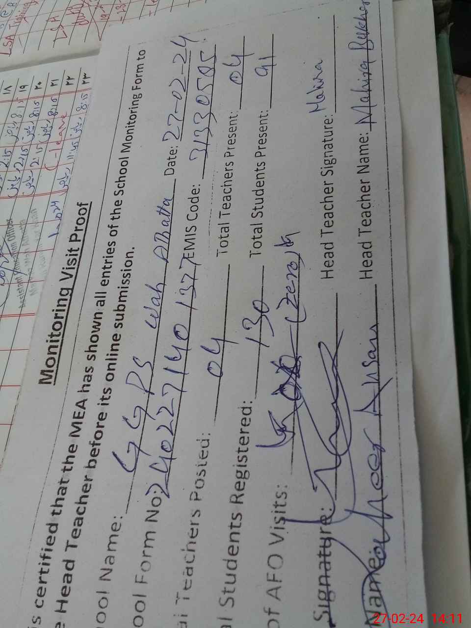 | Attendance Register | Head Teacher | MEA with School | Visit Proof |