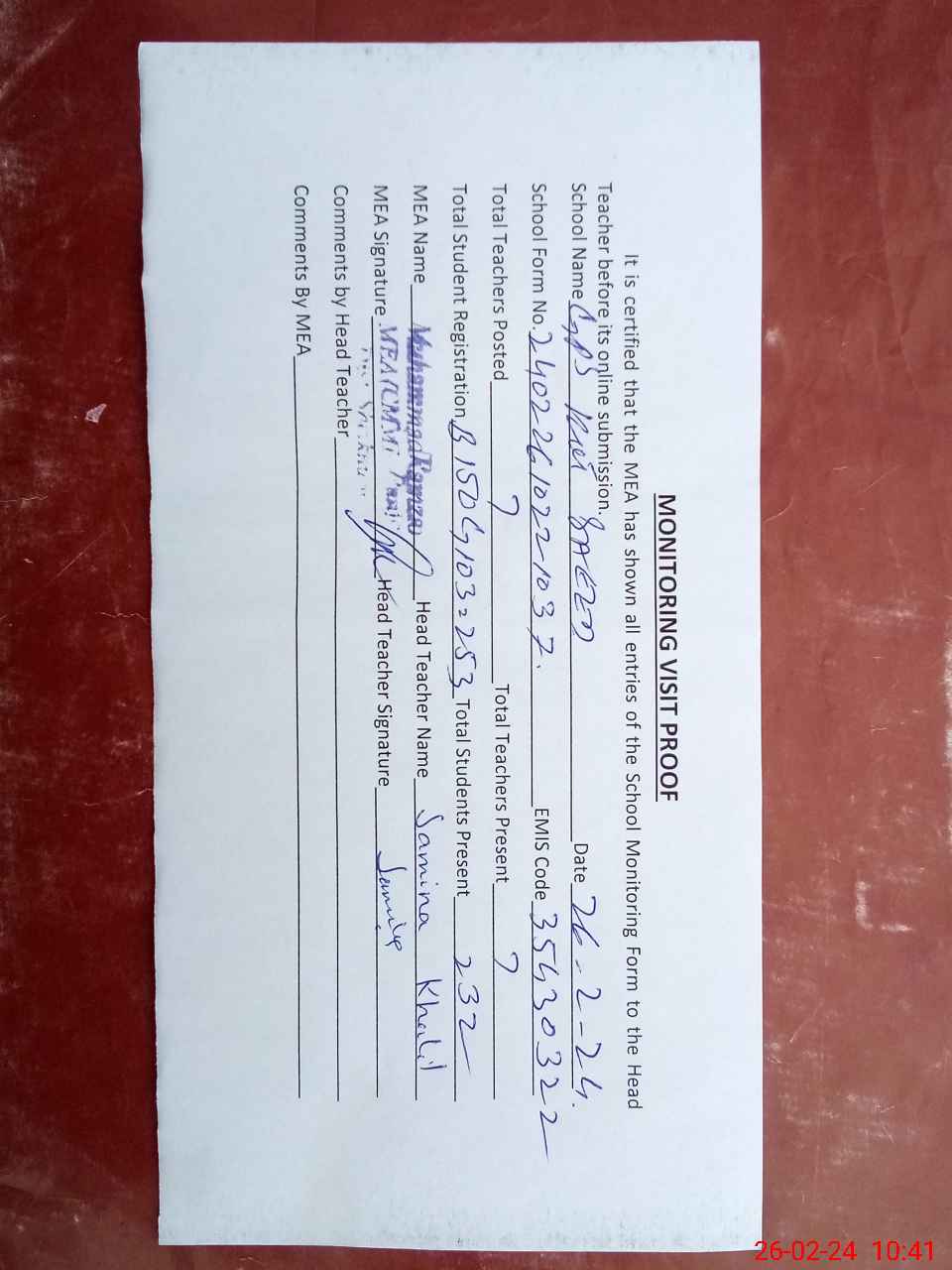 | Attendance Register | Head Teacher | MEA with School | Visit Proof |