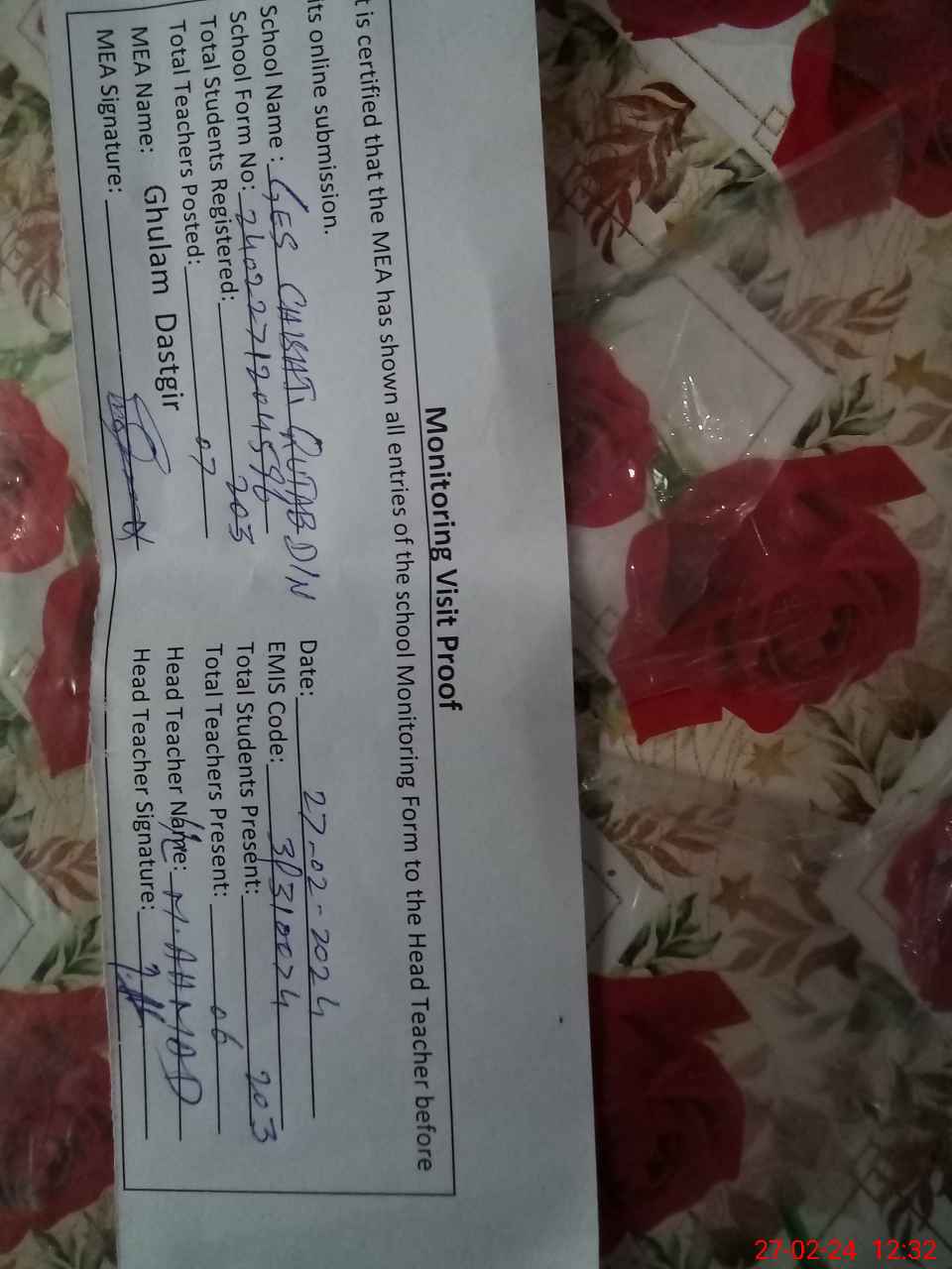 | EMIS Code: 39310074 | Name of School: GES CHISHTI QUTAB DIN | |||