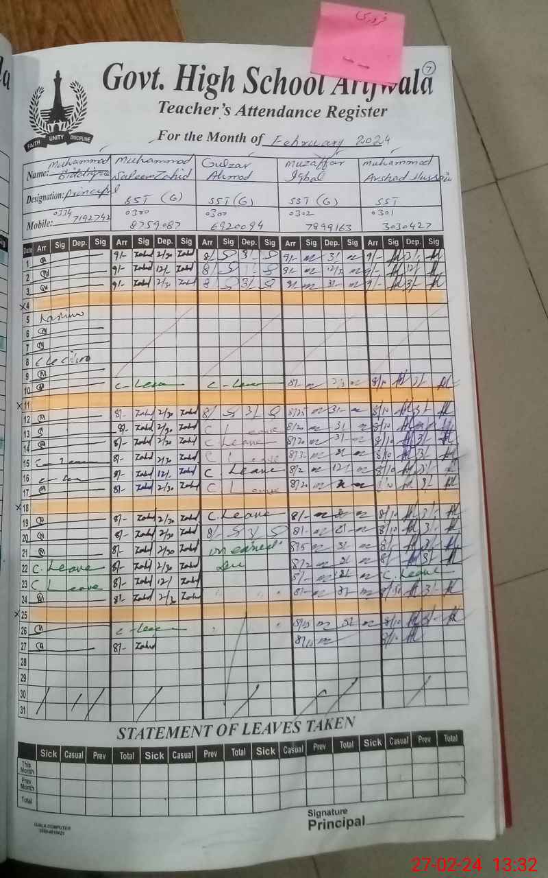 | CNIC | Full Name | Designation | R/C | Absence During Last Calender Month |
