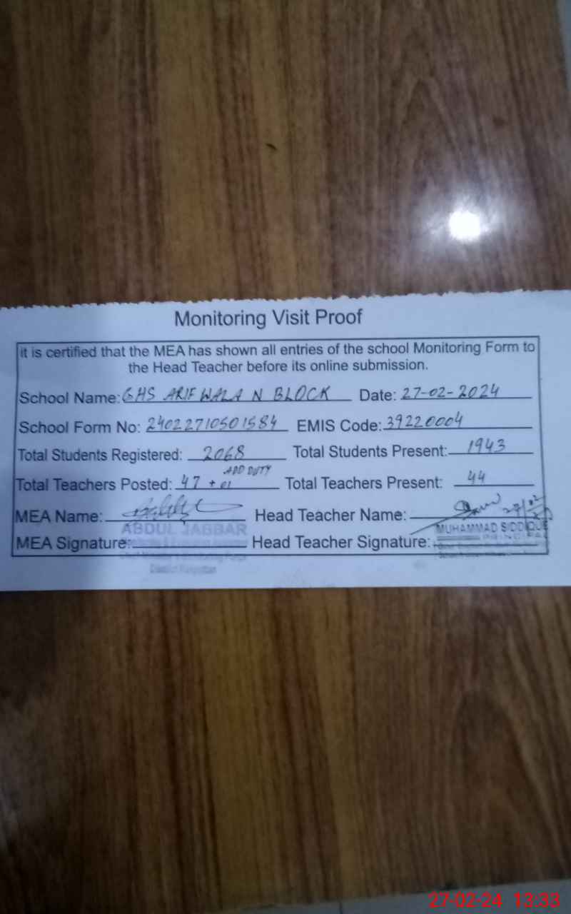 | EMIS Code: 39220004 | Name of School: GHS ARIFWALA N BLOCK | |||