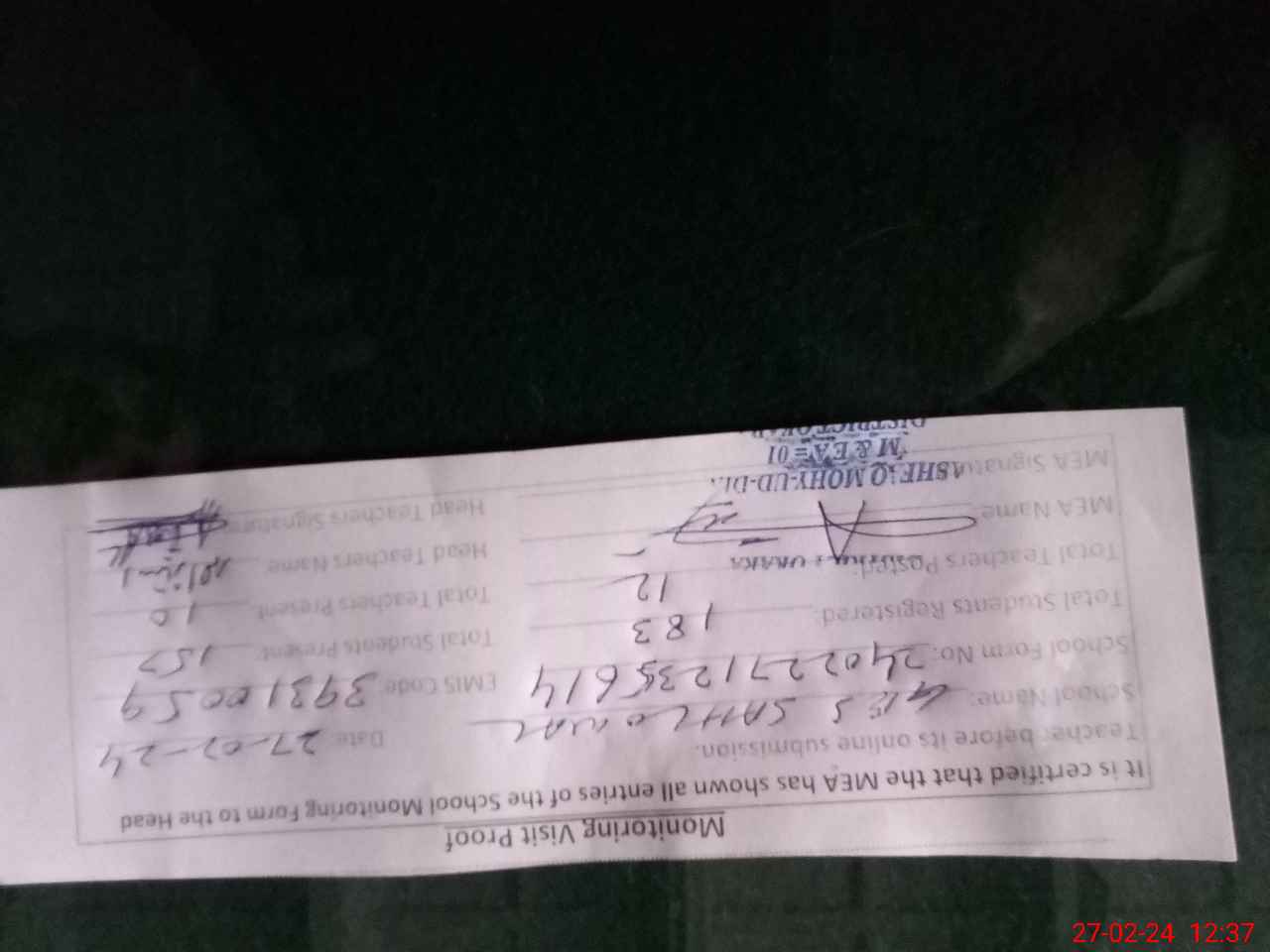 | Attendance Register | Head Teacher | MEA with School | Visit Proof |