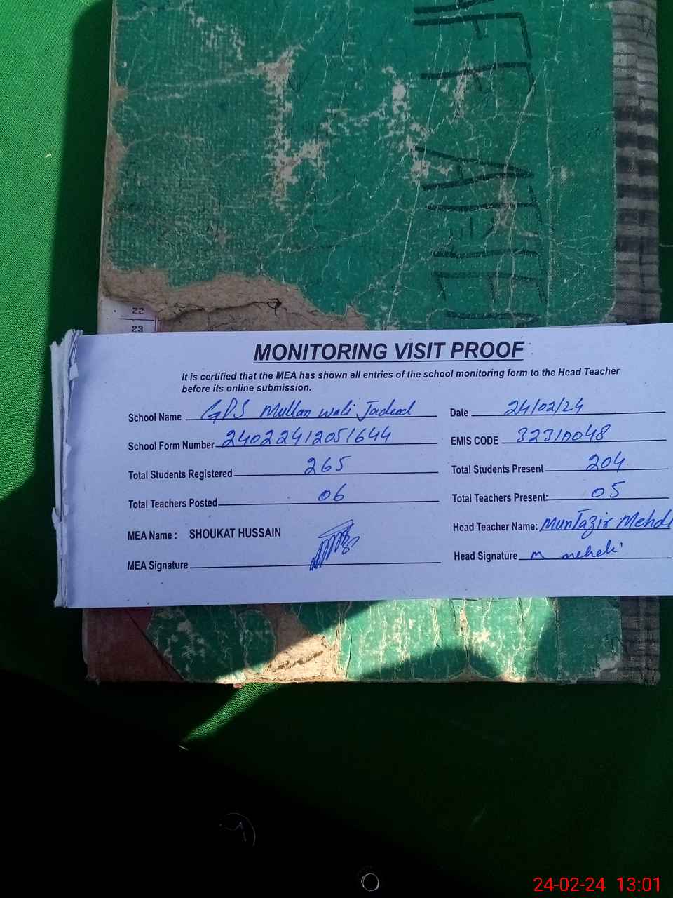 | Attendance Register | Head Teacher | MEA with School | Visit Proof |