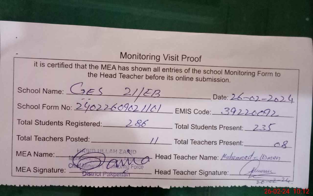 | Certified that this School was Inspected by the Undersigned MEA/DMO Today and the Information Stated Above is as Per Record. | |||||