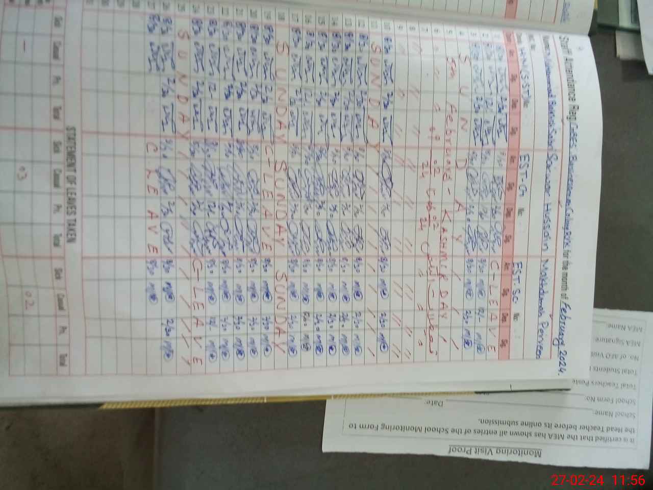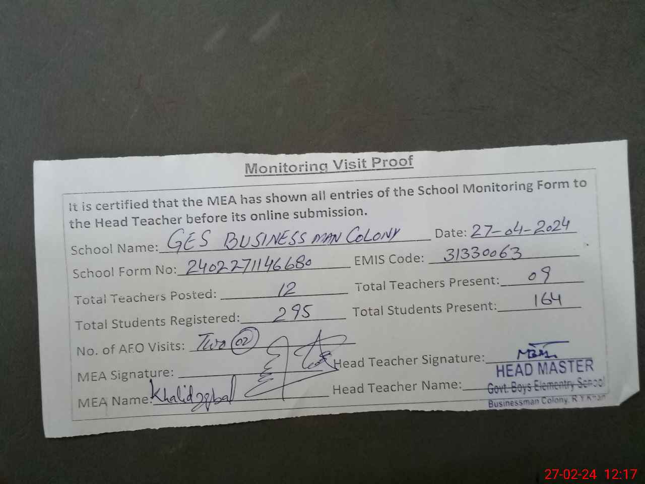 | Attendance Register | Head Teacher | MEA with School | Visit Proof |