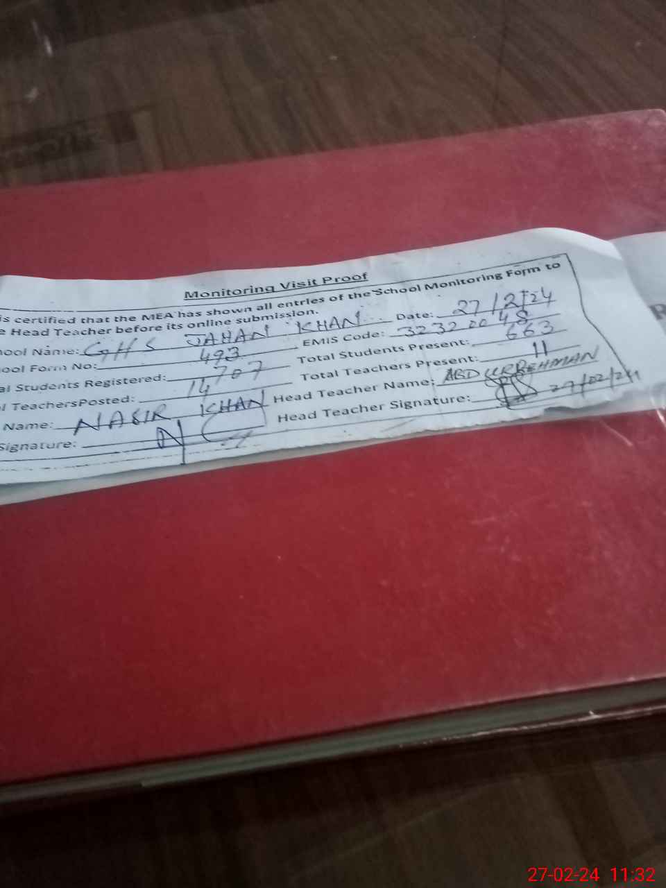 | Attendance Register | Head Teacher | MEA with School | Visit Proof |