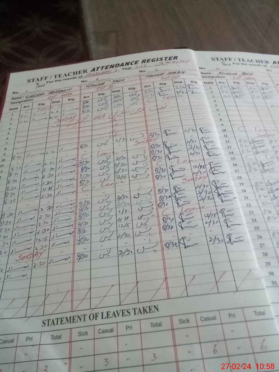 | CNIC | Full Name | Designation | R/C | Absence During Last Calender Month |