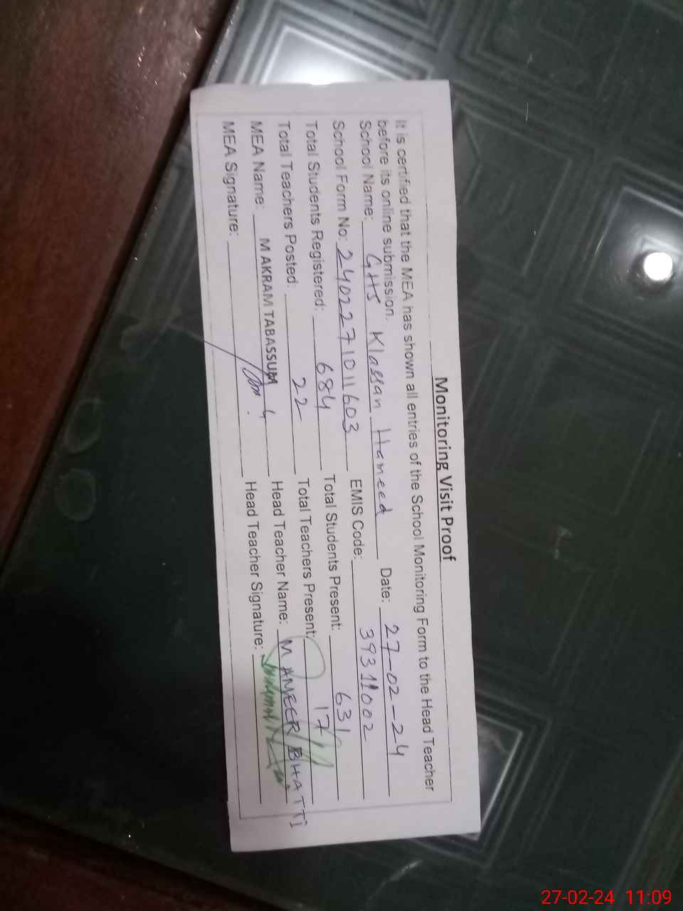 | Attendance Register | Head Teacher | MEA with School | Visit Proof |