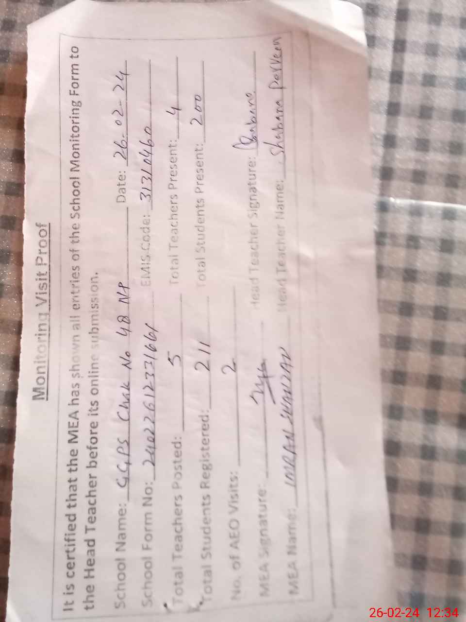 | Attendance Register | Head Teacher | MEA with School | Visit Proof |