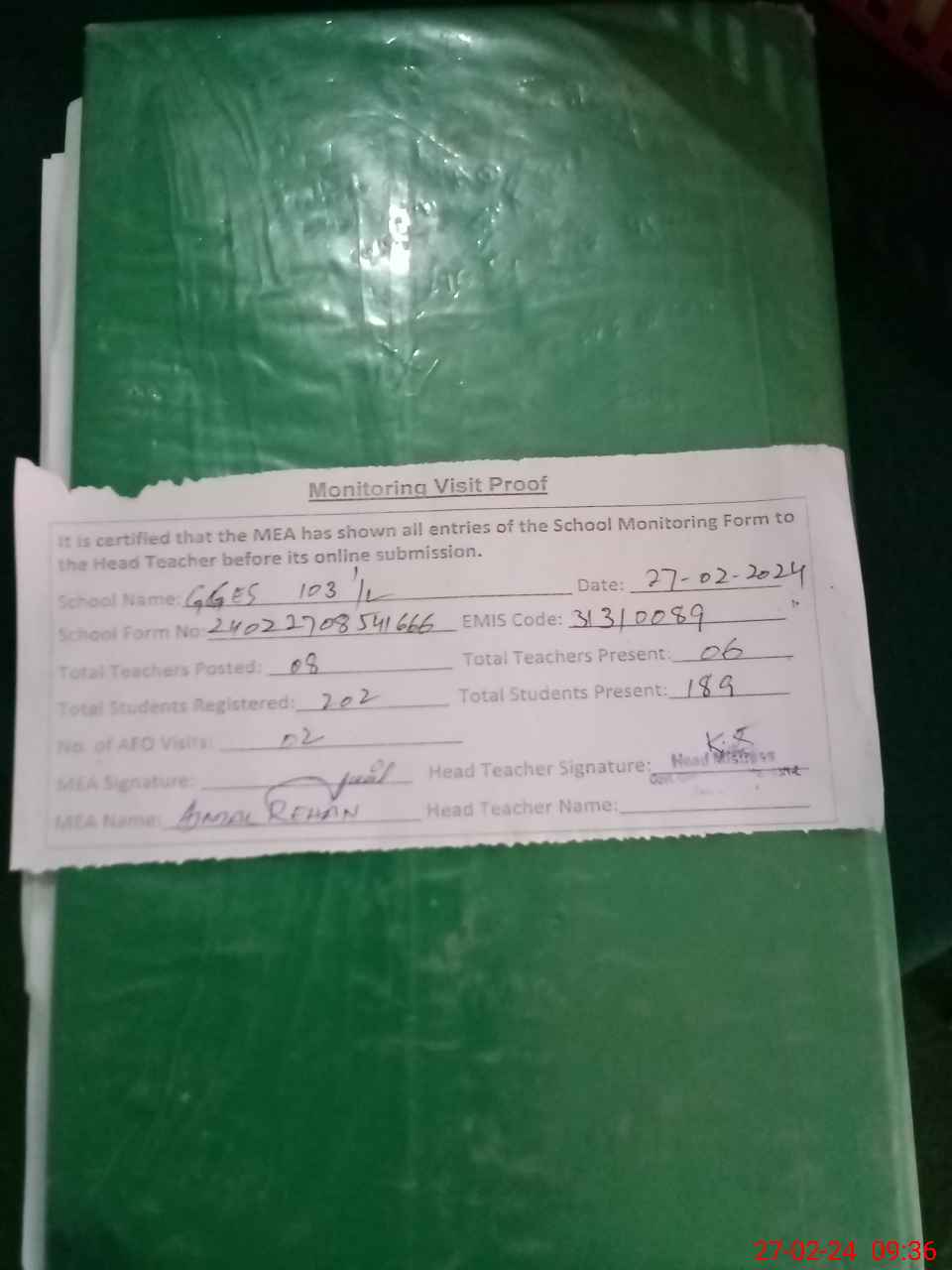 | Attendance Register | Head Teacher | MEA with School | Visit Proof |