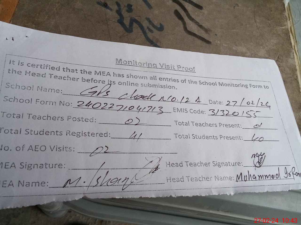 | EMIS Code: 31320155 | Name of School: GPS CHAK 12/A | |||
