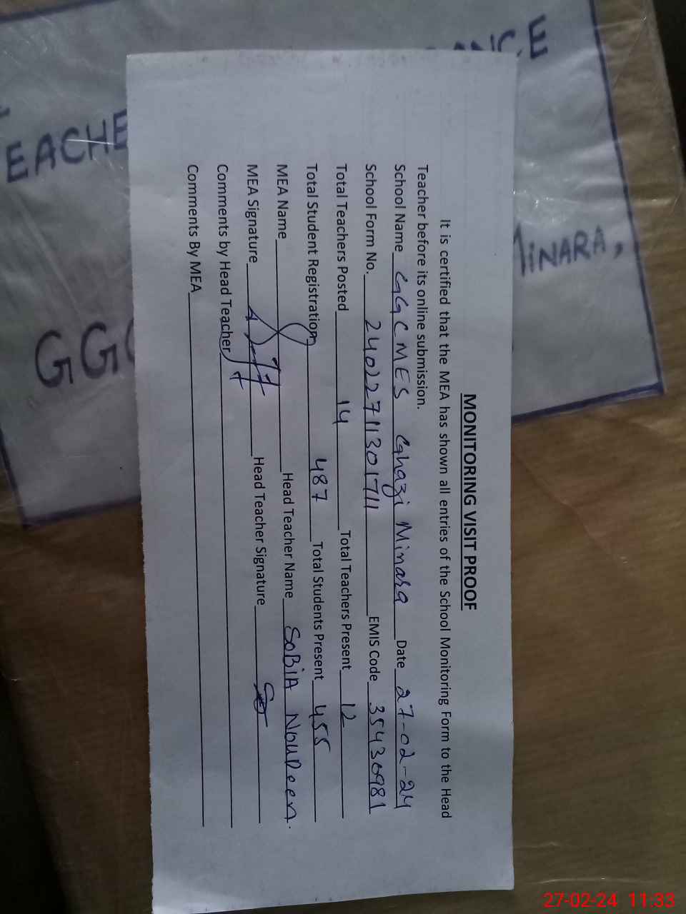 | Attendance Register | Head Teacher | MEA with School | Visit Proof |