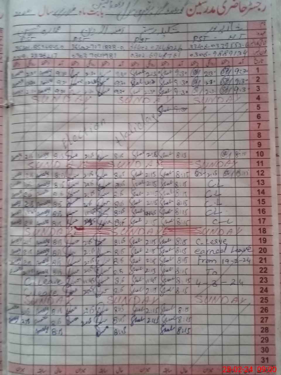 | CNIC | Full Name | Designation | R/C | Absence During Last Calender Month |