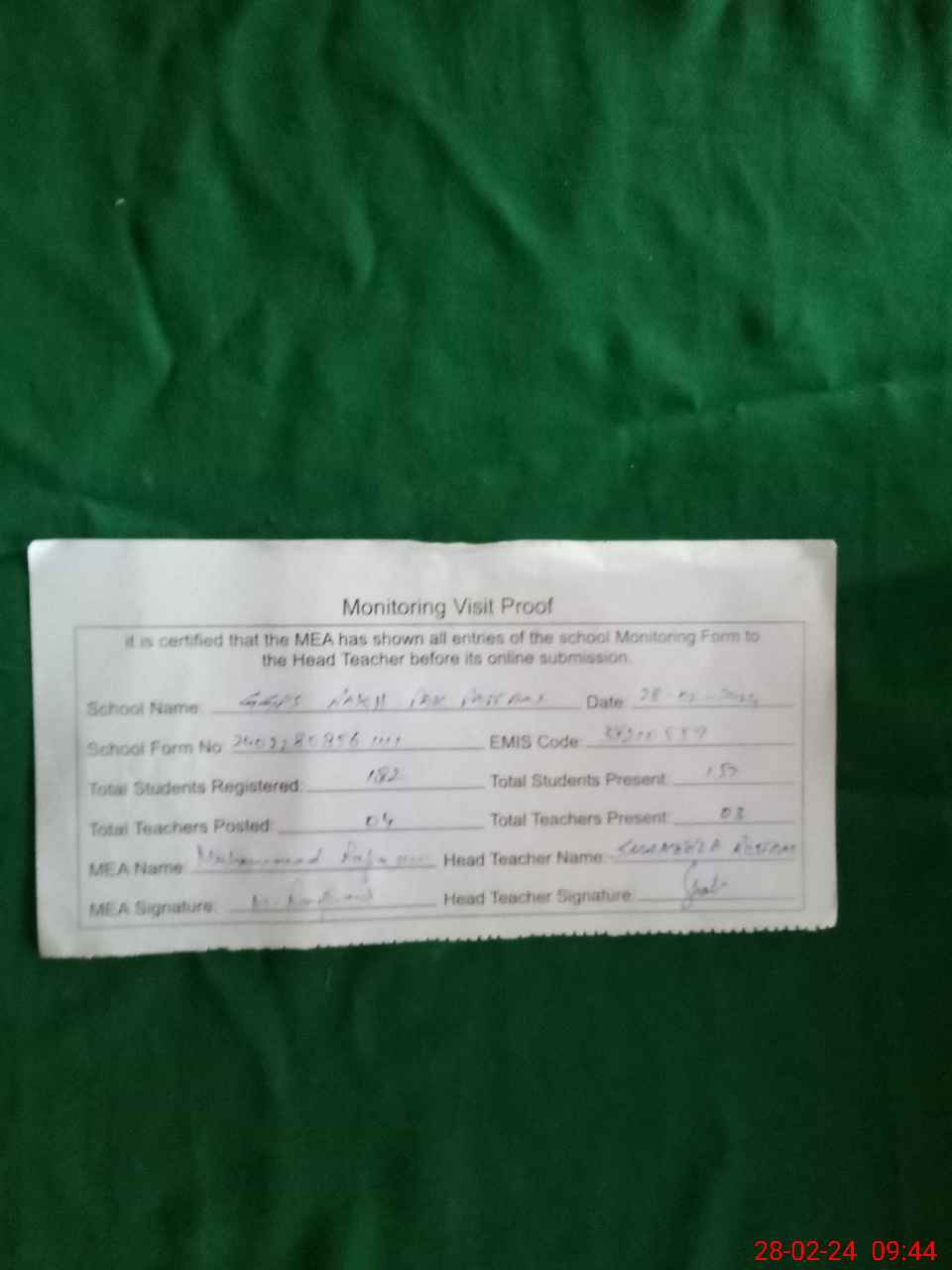 | Attendance Register | Head Teacher | MEA with School | Visit Proof |