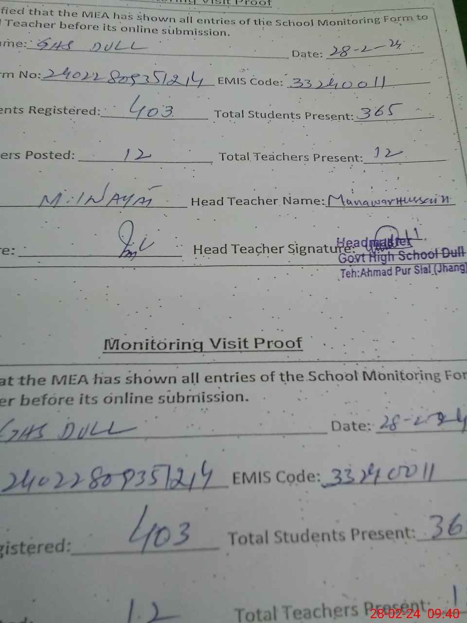 | Attendance Register | Head Teacher | MEA with School | Visit Proof |