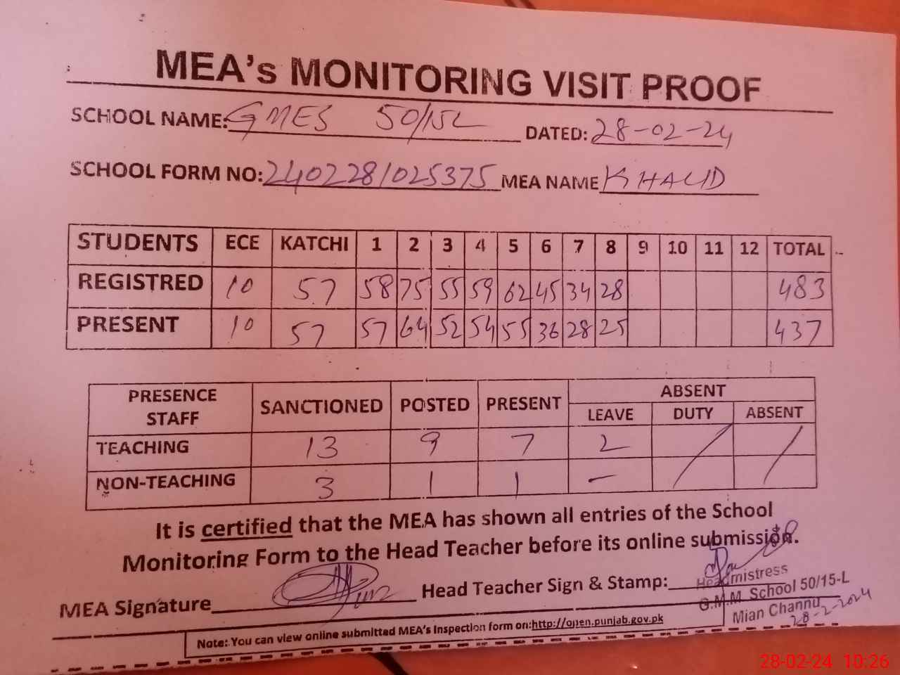 | EMIS Code: 36430098 | Name of School: GGES 50/15-L, MIAN CHANNU | |||