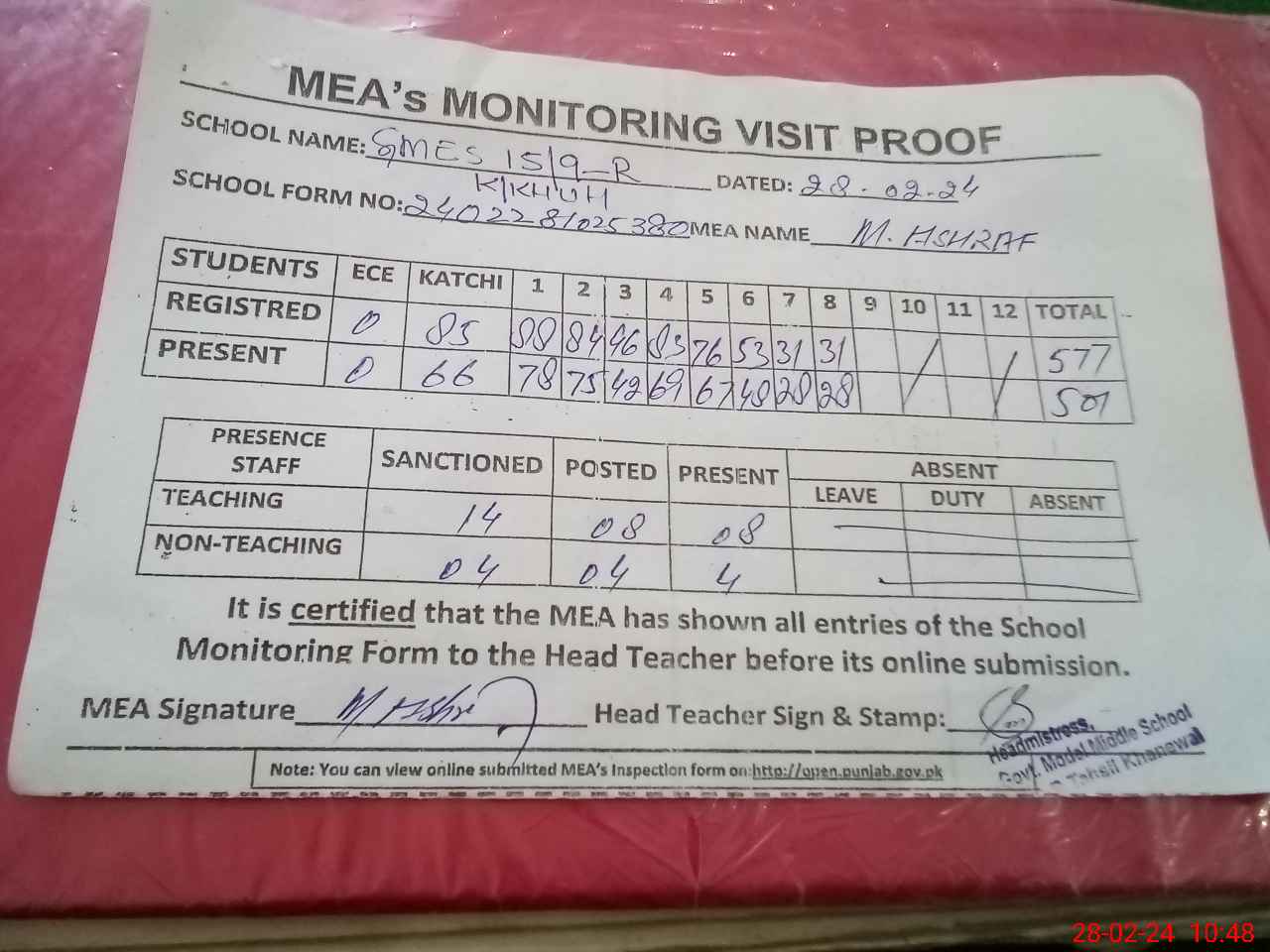 | Attendance Register | Head Teacher | MEA with School | Visit Proof |