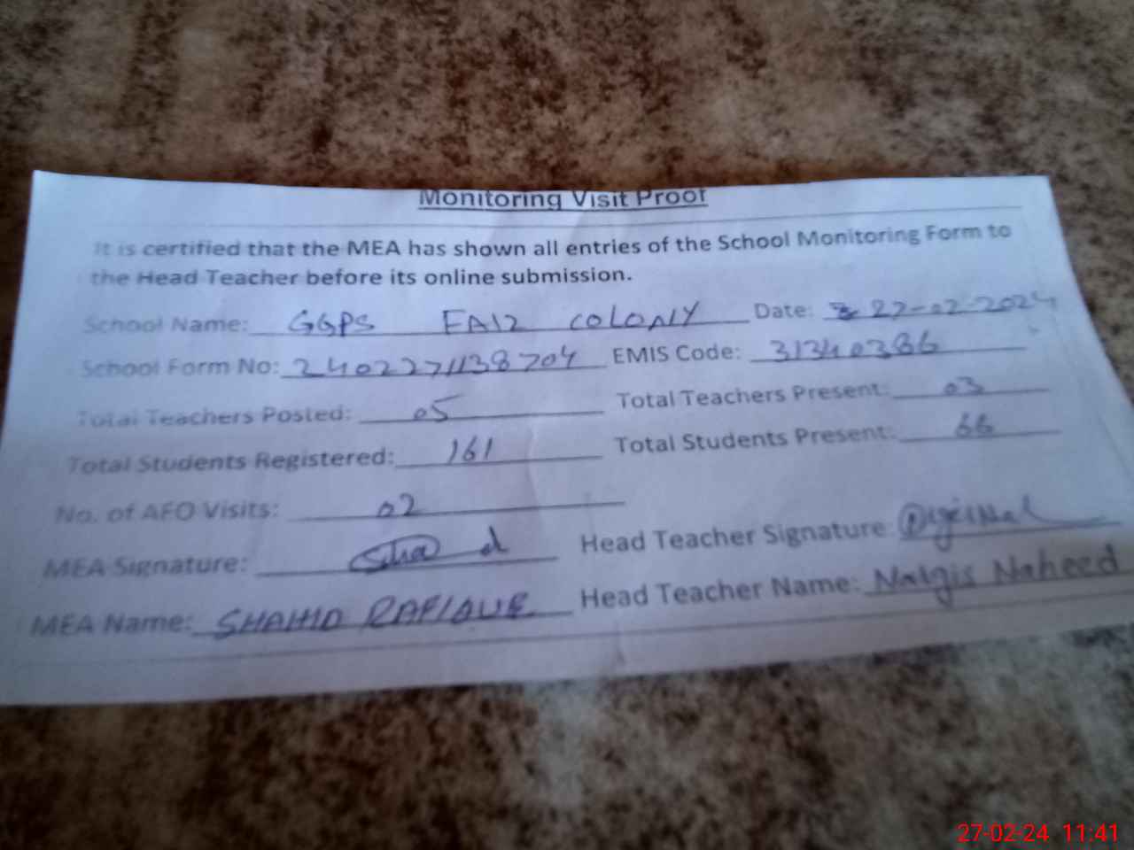 | Attendance Register | Head Teacher | MEA with School | Visit Proof |