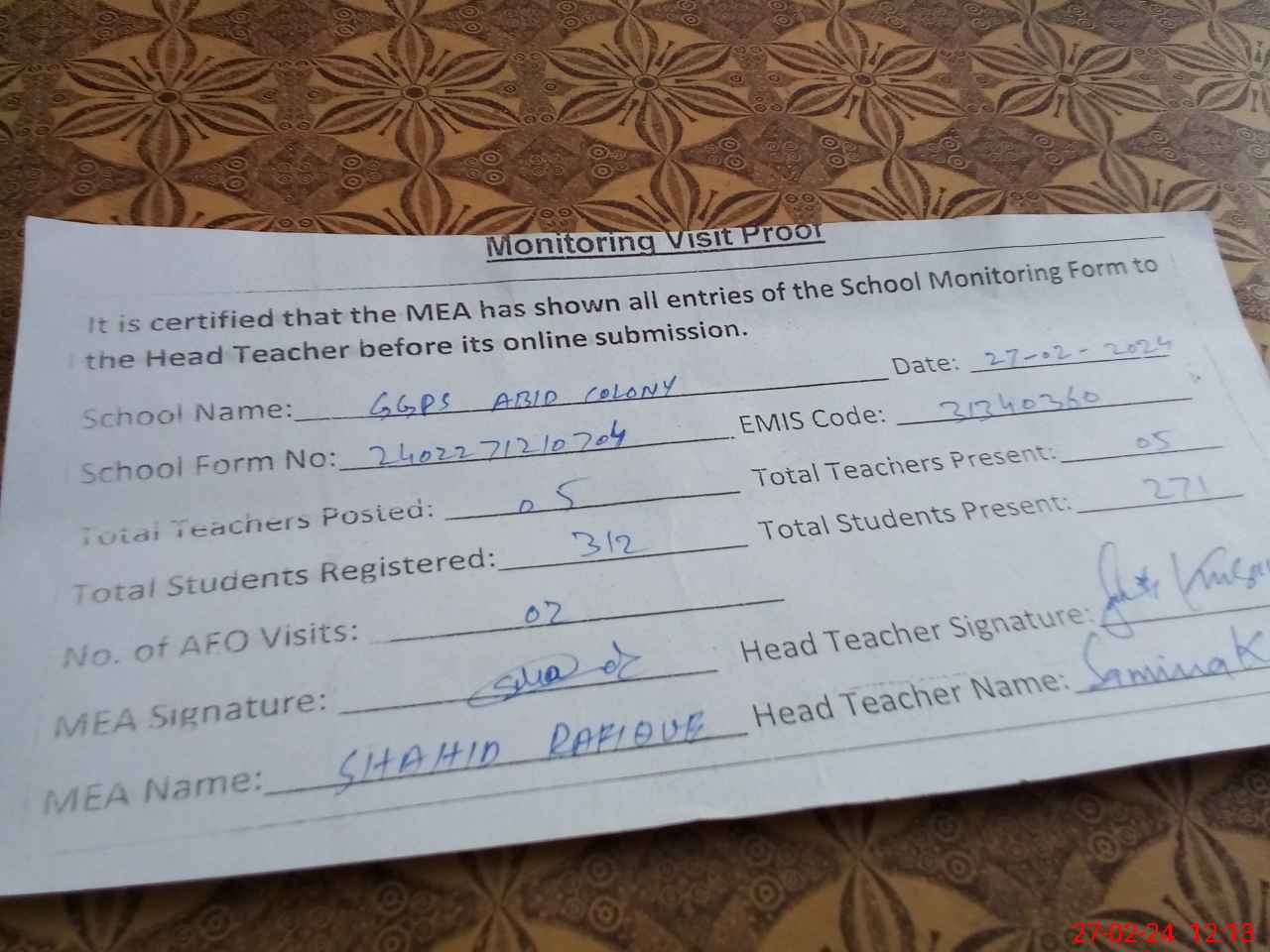 | EMIS Code: 31340360 | Name of School: GGPS ABID COLONY 51 NP | |||