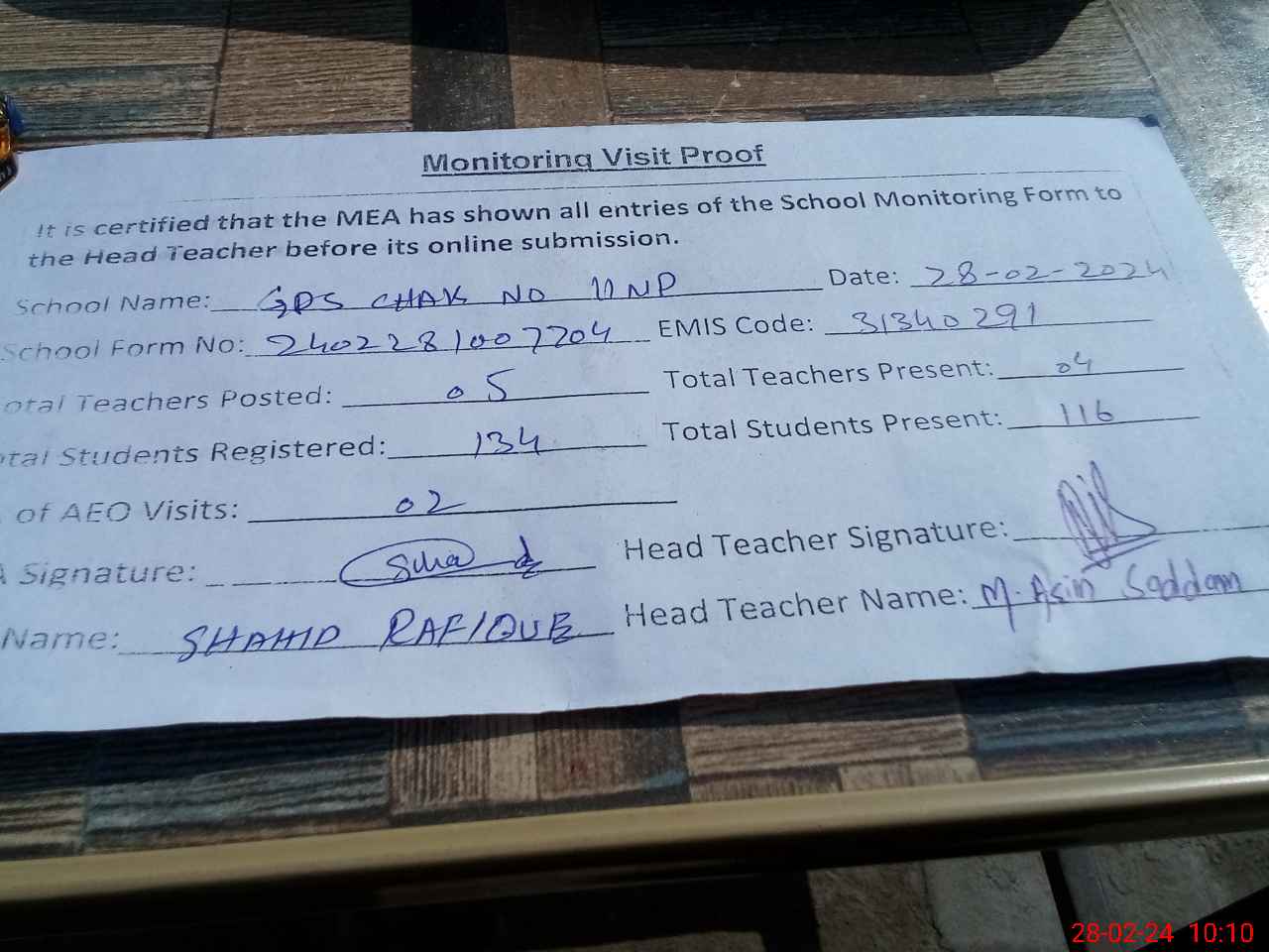 | Attendance Register | Head Teacher | MEA with School | Visit Proof |