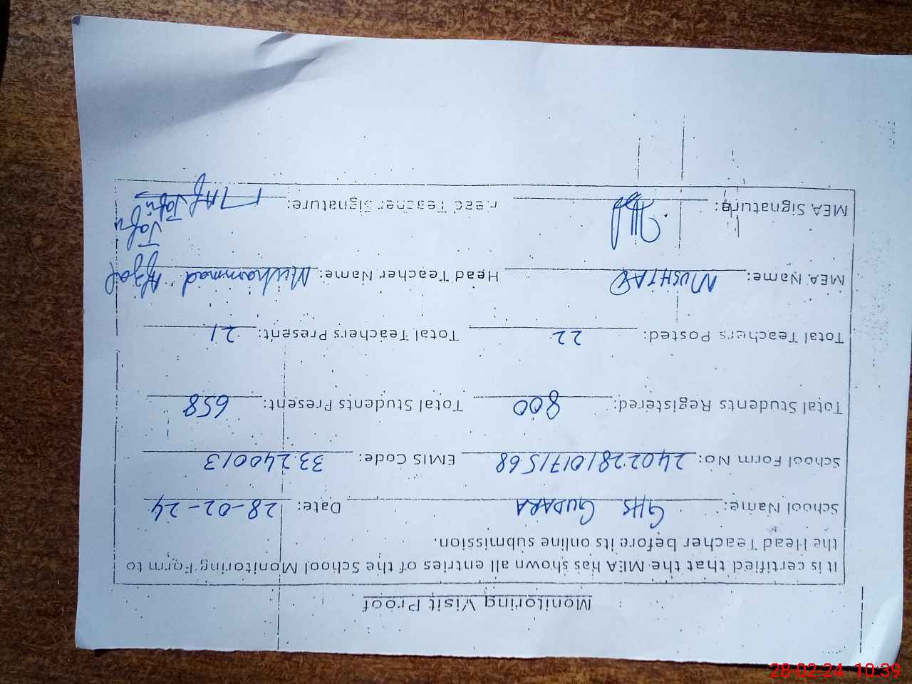 | Certified that this School was Inspected by the Undersigned MEA/DMO Today and the Information Stated Above is as Per Record. | |||||