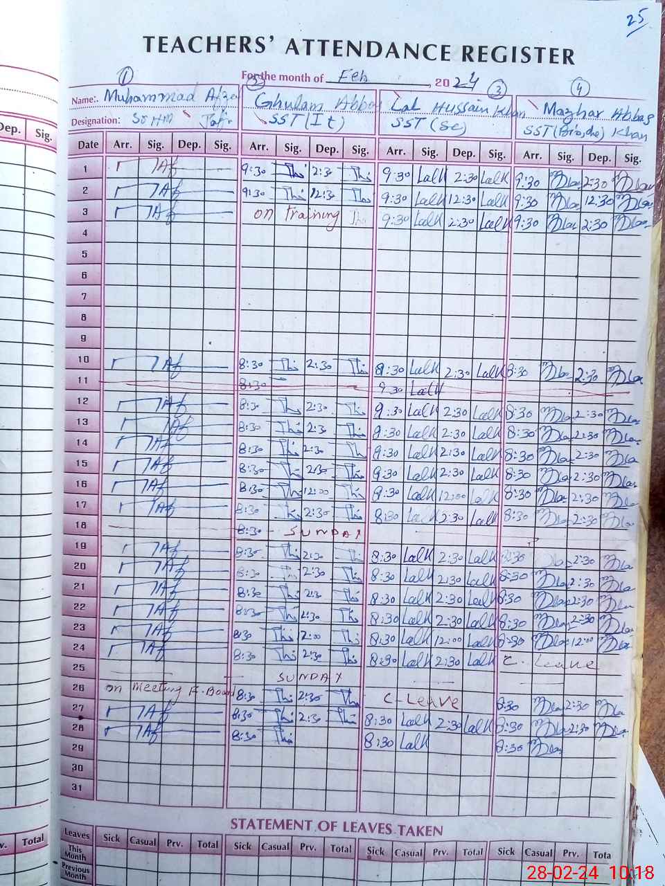 | Leave | Duty | Absent | Maternity | Medical | Ex- Pak |