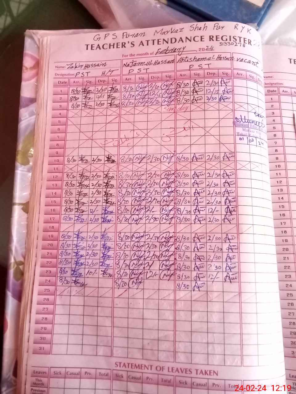 | Name: ZA**** HU**** Designation: (School Headmaster's/Headmistress's) PST/PTC/JV Phone/Cell Number: 03**** |