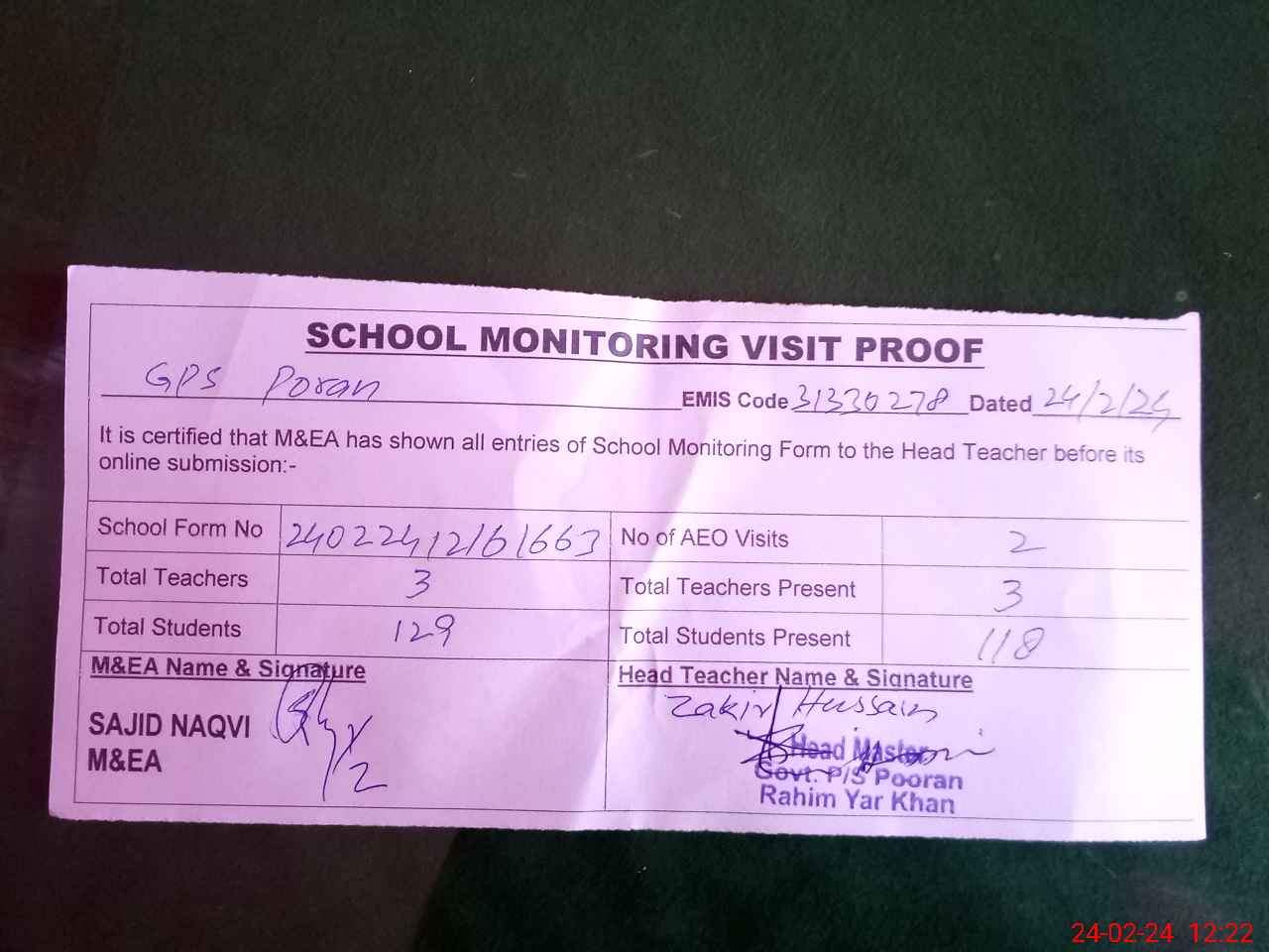 | Attendance Register | Head Teacher | MEA with School | Visit Proof |