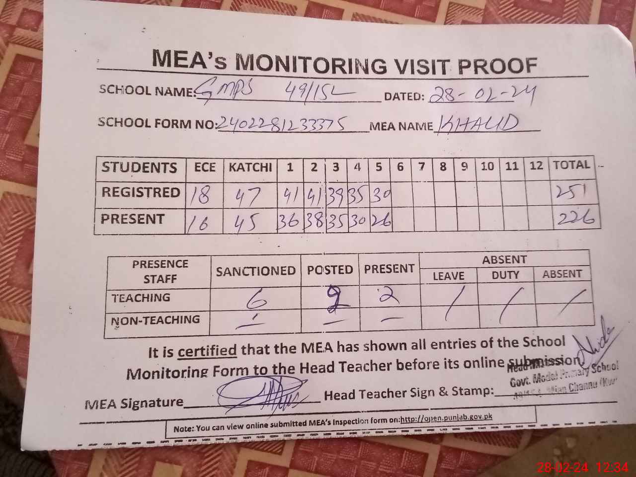 | Attendance Register | Head Teacher | MEA with School | Visit Proof |