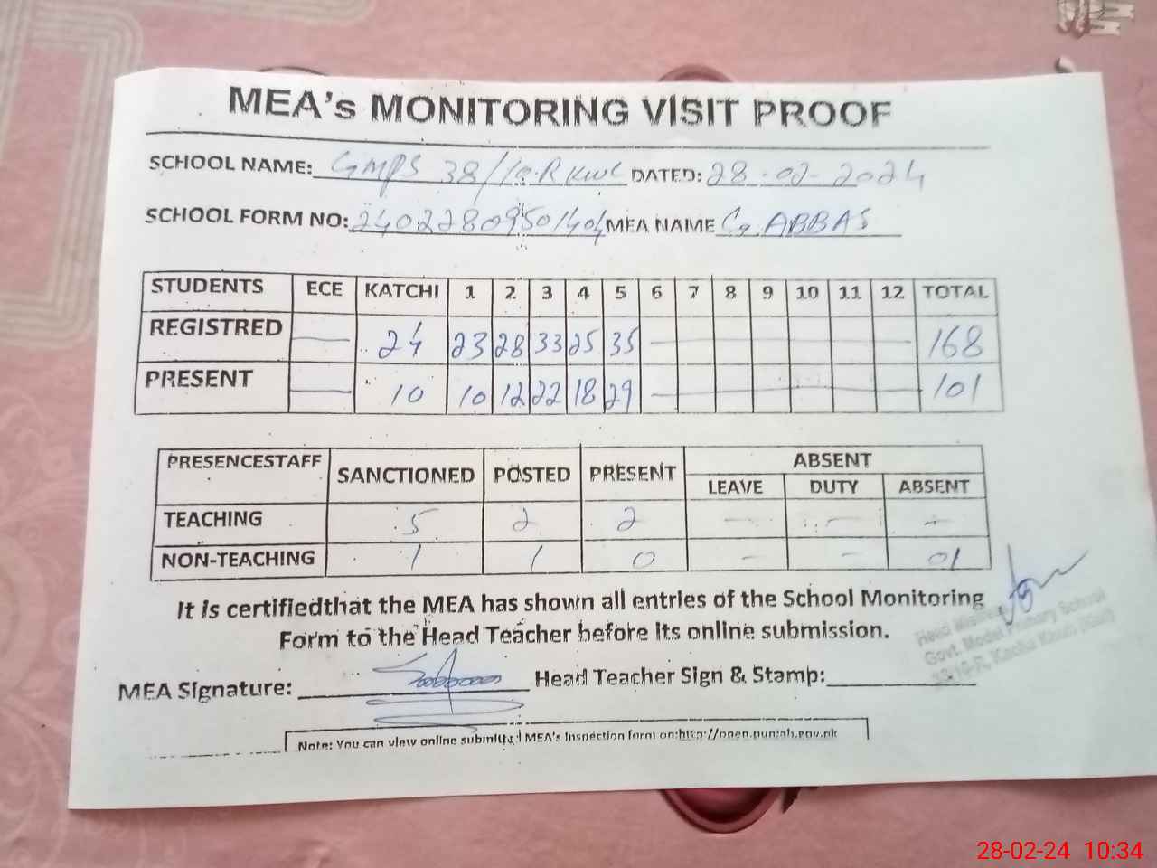 | Certified that this School was Inspected by the Undersigned MEA/DMO Today and the Information Stated Above is as Per Record. | |||||