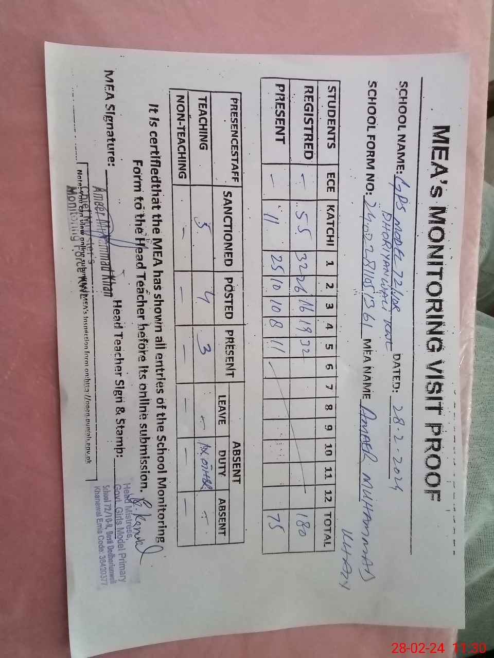| EMIS Code: 36420377 | Name of School: GPS MODEL 72/10-R, DHORIYAN WALI, KHANEWAL | |||
