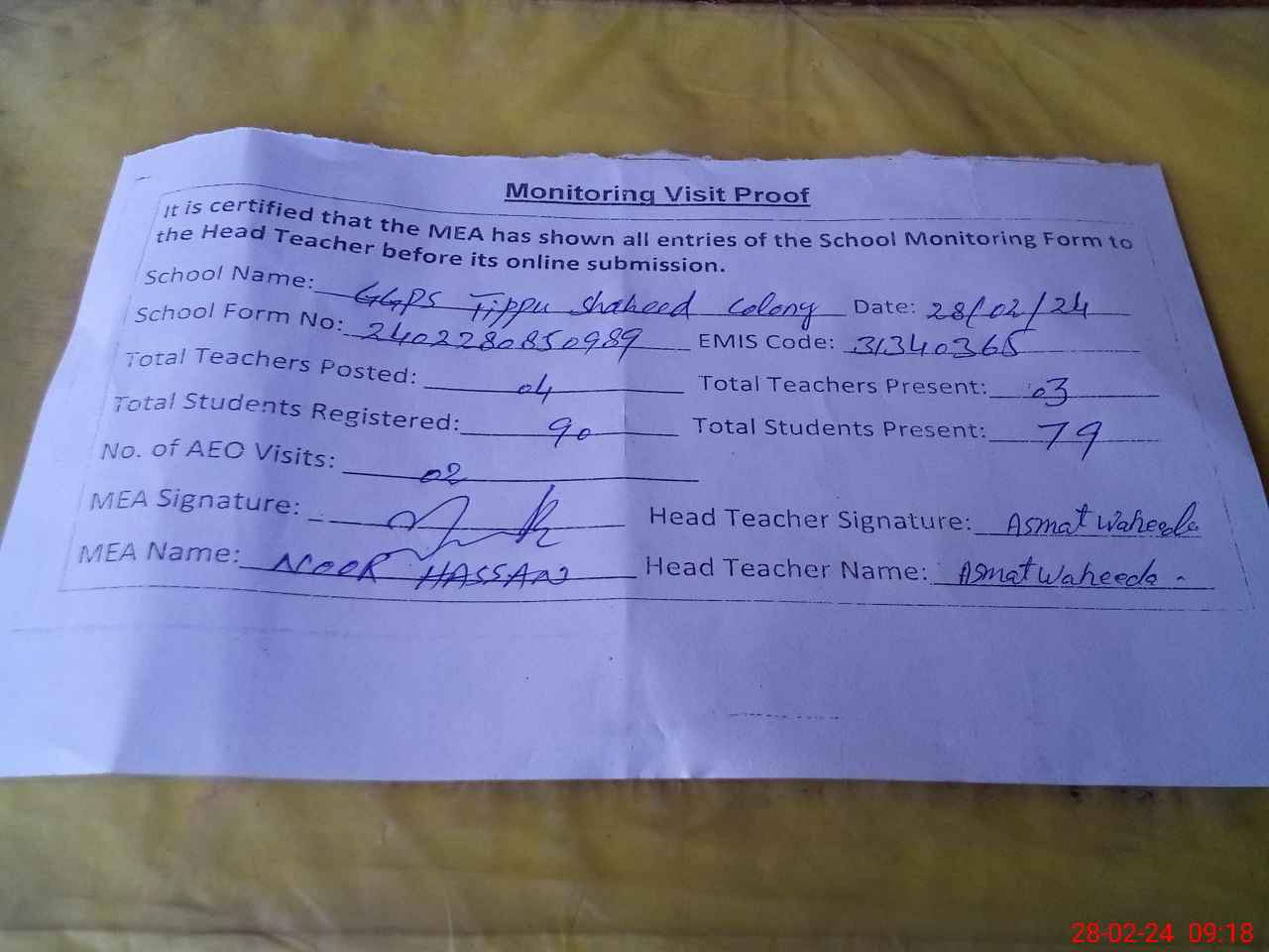 | Attendance Register | Head Teacher | MEA with School | Visit Proof |