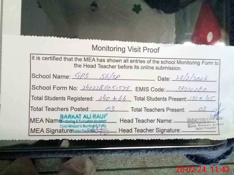 | EMIS Code: 39210260 | Name of School: GPS CHAK NO. 56 SP | |||
