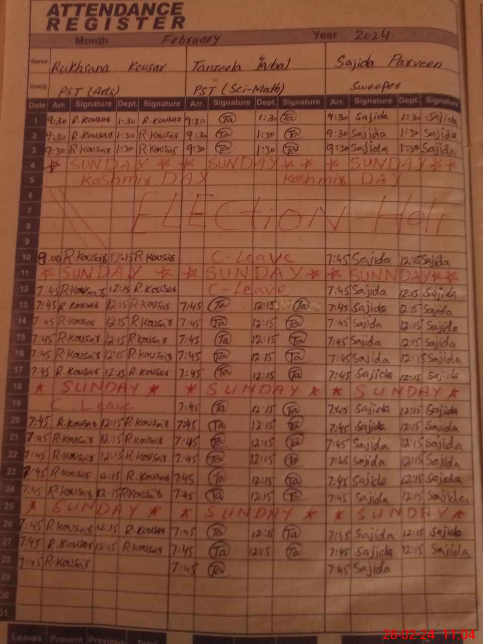 | CNIC | Full Name | Designation | R/C | Absence During Last Calender Month |