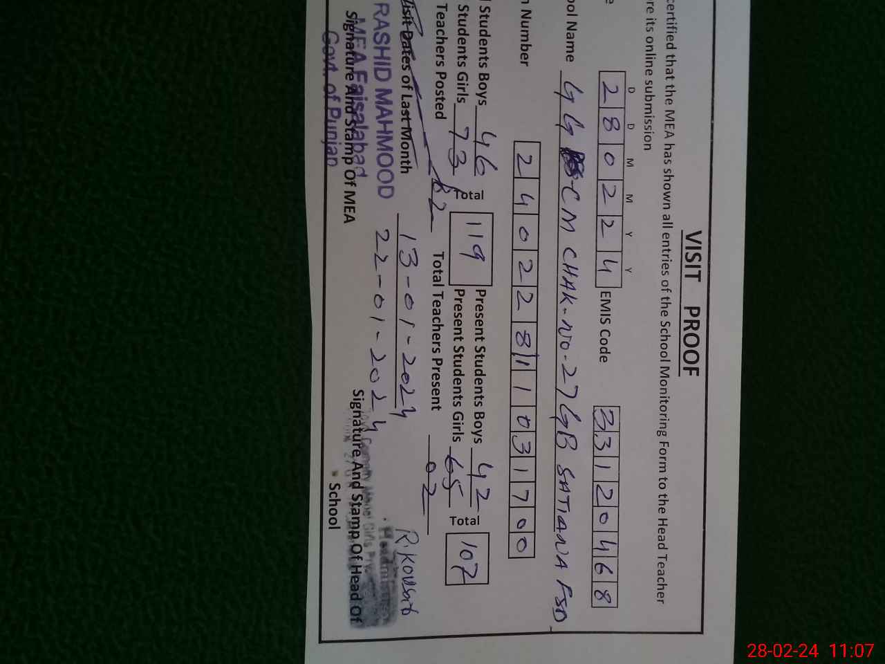 | Certified that this School was Inspected by the Undersigned MEA/DMO Today and the Information Stated Above is as Per Record. | |||||