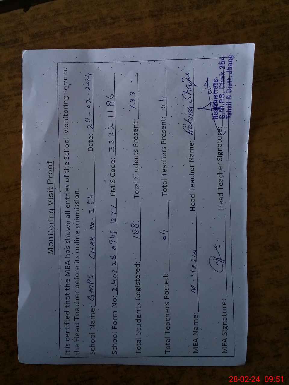 | EMIS Code: 33221186 | Name of School: GMPS CHAK NO 254 II | |||