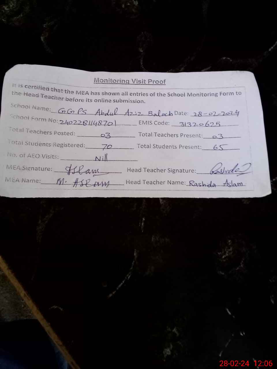 | EMIS Code: 31320625 | Name of School: GGPS ABDUL AZIZ BALOCH | |||